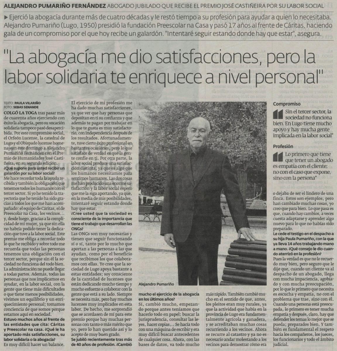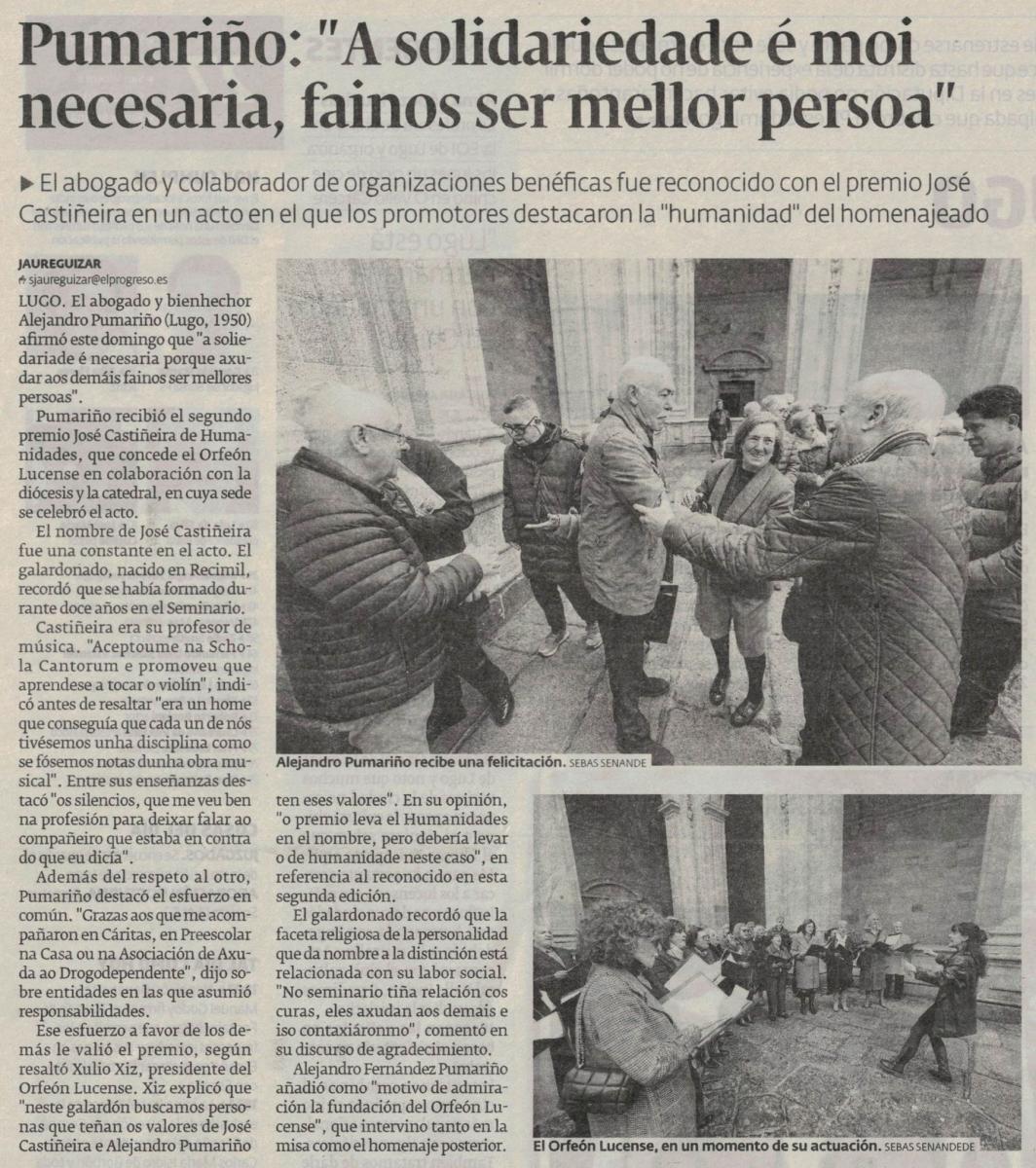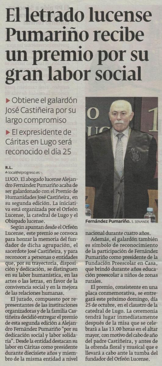 O avogado lucense Alejandro Fernández Pumariño vén de ser distinguido co premio José Castiñeira de Humanidades na súa II edición. O premio está convocado polo Orfeón Lucense, a S.I.C.B de Lugo e o Bispado lucense.